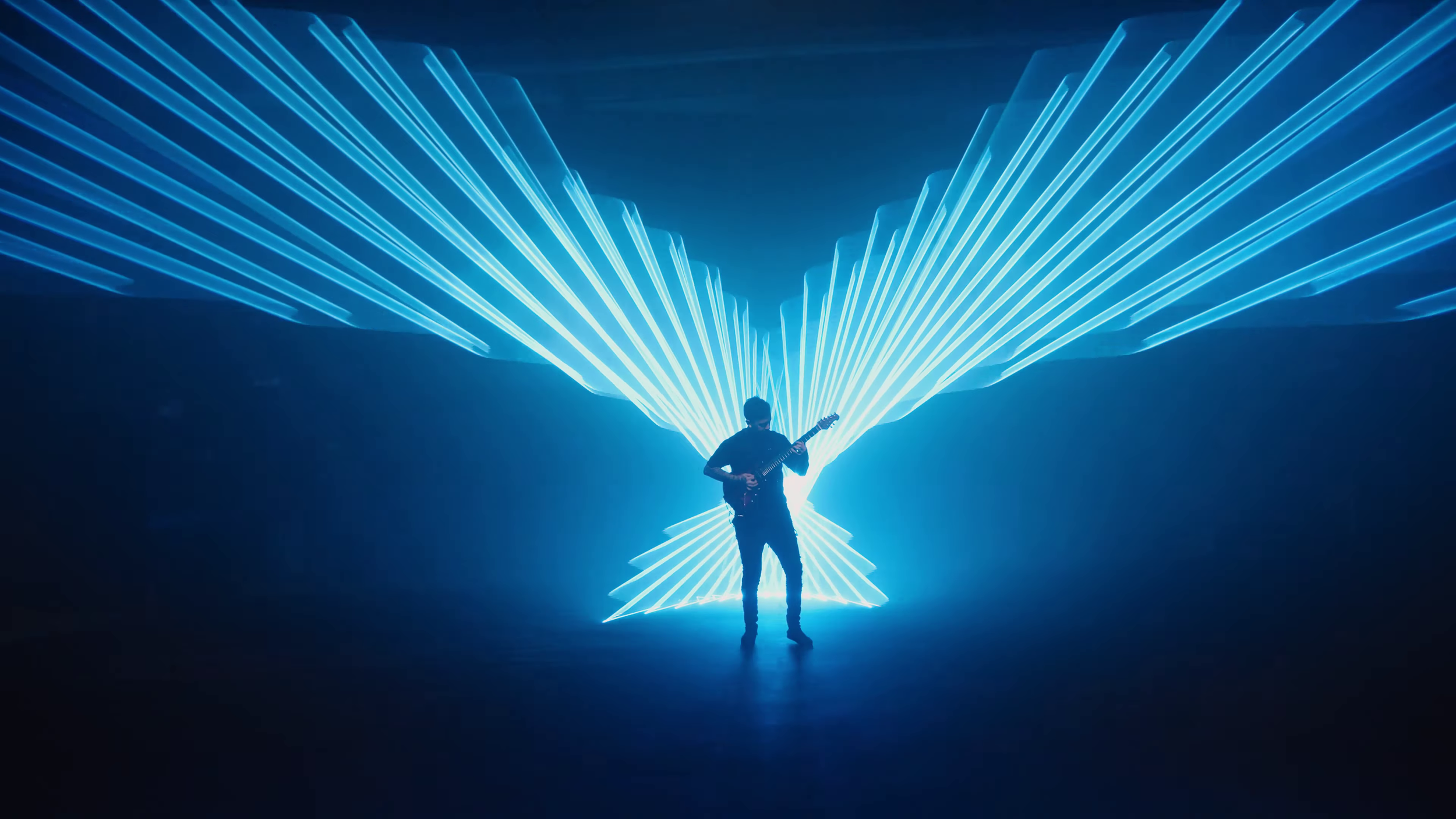 Laser Banding allowed us to generate shapes and patterns that only appear through the camera lens—sweeping wings, gravity-defying beams, liquid spotlights. These effects mirrored Richardson’s speed and precision, surrounding him with aggressive, futuristic visuals that amplified the drama of each song. On camera, the beams became an extension of the music, translating shred into light.